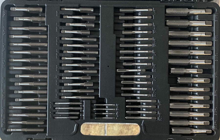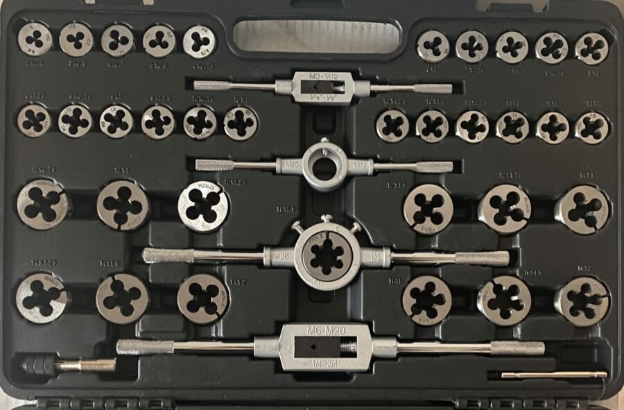 2 x porte-filières 2 x porte-tarauds 1 x poignée en T 70 x tarauds 35 x filières : M2 x 0.4 – M3 x 0.5 – M4 x 0.7 – M5 x 0.8 – M6 x 1.0 M6 x 0.75 – M7 x 1.0 – M7 x 0.75 – M8 x 0.75 – M8 x 1.0 M8 x 1.25 – M9 x 0.75 – M9 x 1.0 – M9 x 1.25 – M10 x 0.75 M10 x 1.0 – M10 x 1.25 – M10 x 1.5 – M11 x 0.75 – M11 x 1.0 M11 x 1.25 – M11 x 1.5 – M12 x 0.75 – M12 x 1.0 – M12 x 1.25 M12 x 1.5 – M12 x 1.75 – M14 x 1.0 – M14 x 1.25 – M14 x 1.0 M14 x 2.0 – M16 x 1.0 – M16 x 1.5 – M16 x 2.0 – M18 x 1.5