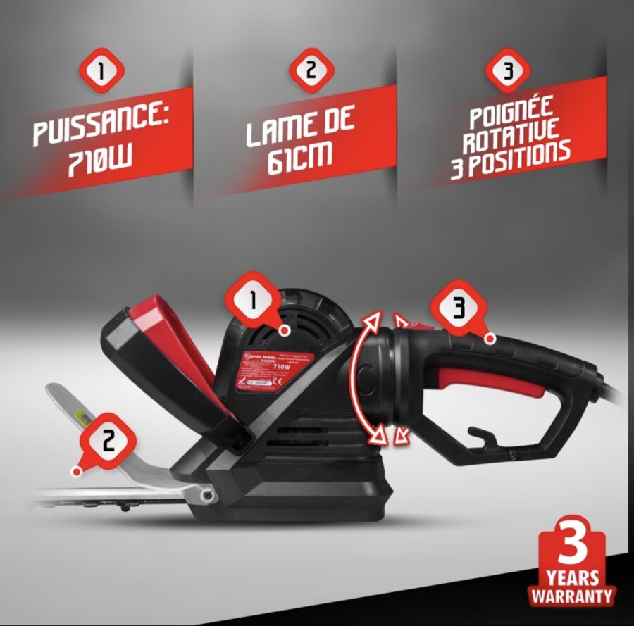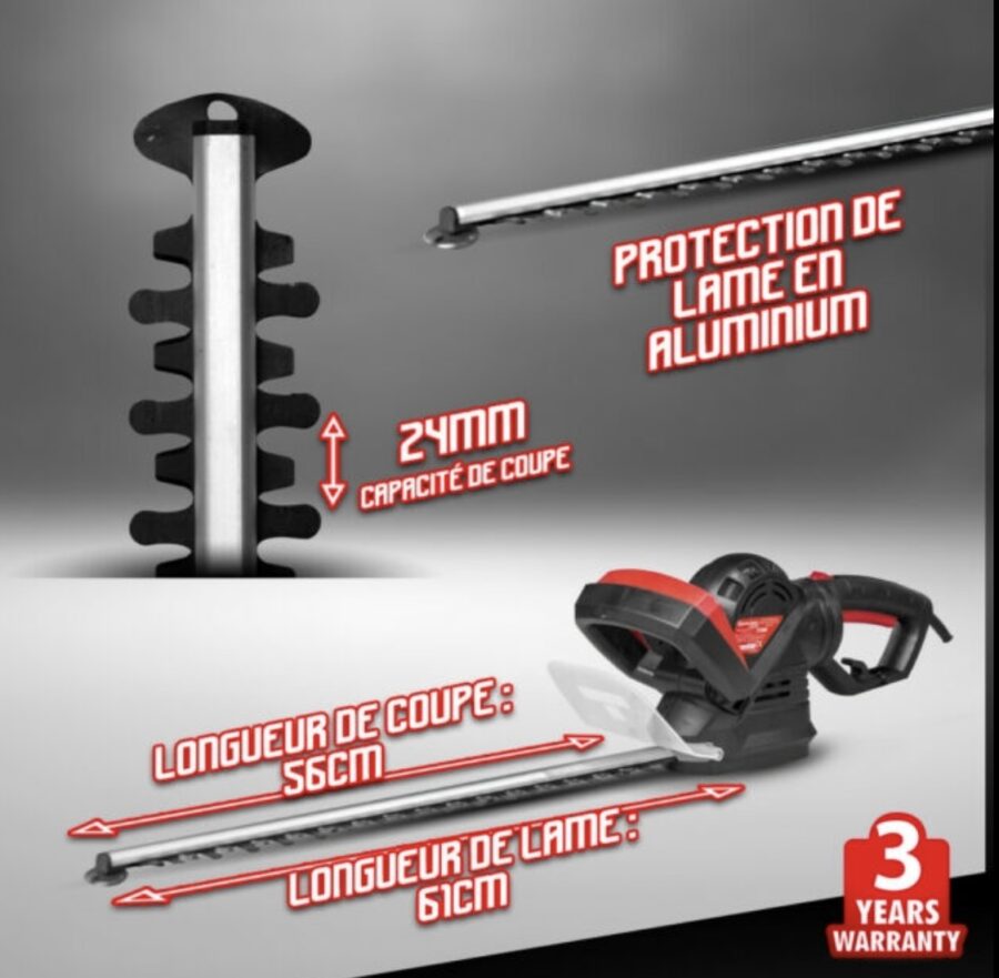 Taille haie 500W Elem Garden Puissance : 500W Longueur de lame : 51cm Longueur de coupe : 46cm Capacité de coupe Max : 16mm Vitesse : 1750T/min Garantie de 3 ans extensible à 6 ans